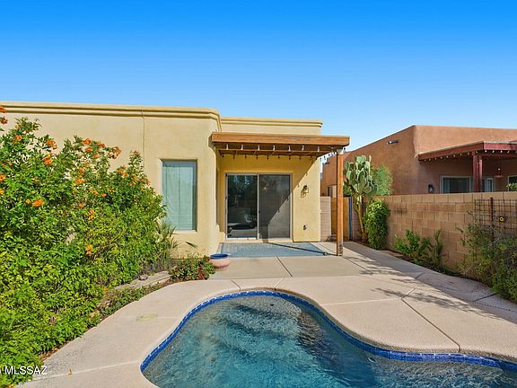 Charming 3BD/2BA (1,376 sq ft) home on cul-de-sac street in Rams Canyon in desirable Oro Valley boasts Pusch Ridge views, relaxing pool and no one directly behind. Enter the gated courtyard with mature shade tree and flowering shrubs. Foyer flows to an open concept plan highlighted by wood beam & plank ceiling, wood slat blinds, plus porcelain tile floors throughout. Chef's kitchen hosts a suite of newer LG appliances (2018-21) and ''Smart Station' kitchen sink. Lovely Primary Suite affords a recessed alcove with views plus ensuite w/ dual sink vanity, updated walk-in shower, custom walk-in closet. Split bedrooms 2 & 3 off hall bath and laundry room w/ newer washer. New flooring & interior paint (2021). Retreat to a covered patio, sparkling pool with rock waterfall and assorted plantings.