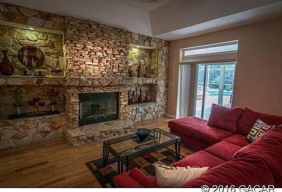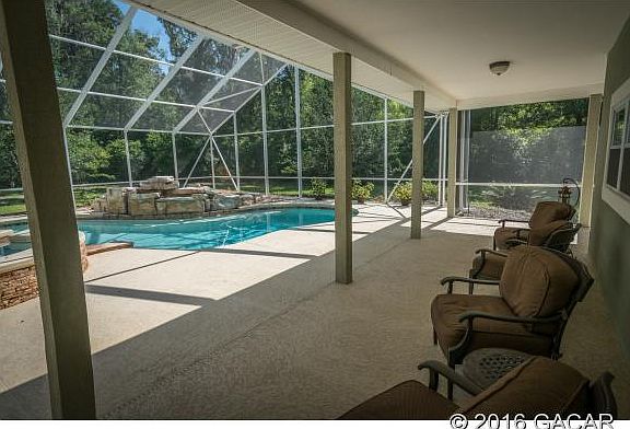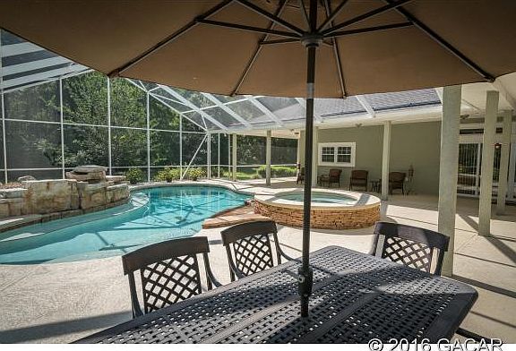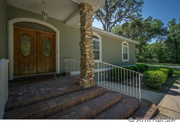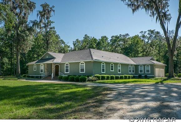 **Under Contract - Backup offers accepted** Private, charming southern home overlooking oak canopy. There is a 3-way split plan, white oak floors, recessed lighting, tray ceilings, great room, fireplace in living room, master jacuzzi and walk-in shower. A 2 car garage is attached to the main house and a separate 6 car-1600SF garage could be converted to an In-Law Suite. A patio retreat showcases a solar heated pool, waterfall and propane heated jacuzzi. There is a Crime Prevention alarm system, a water softener and lead filter remover. Clay Electric serves this poured concrete constructed home (Eco Pest) termite policy is in place. Plenty of storage room exists throughout and exactly 6.4 miles (11 mins. ) to UF. The additional 5.86 acres ne