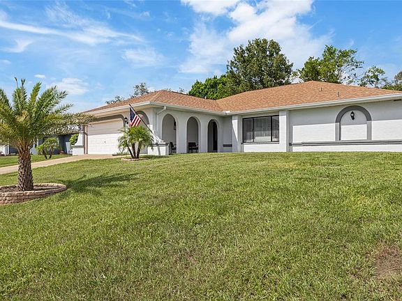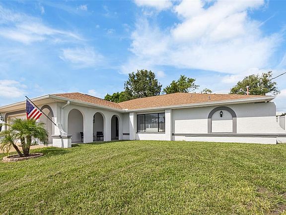 Welcome to this beautifully designed and move-in ready home—this one has it all! Enjoy peace of mind with a 2020 roof, 2022 HVAC, and no HOA or CDD, making it part of a rare find where comfort, style, and flexibility meet. From the moment of arrival, the home impresses with a remodeled entryway featuring fresh exterior paint, custom tilework, and a wide front door that sets the tone for what’s inside. Step into a bright, open-concept layout with a spacious living and dining area, perfect for everyday living or entertaining. The modern kitchen is a true highlight, showcasing granite countertops, ample cabinetry, and a large island ideal for casual meals or gathering with guests. Connected directly to the kitchen is a generous family room with flexible space for a breakfast nook or cozy lounge area. This space features a beautifully designed electric fireplace with a sleek, modern look, set into a striking floor-to-ceiling porcelain stone wall with a built-in TV niche—a true statement piece that adds luxury and warmth to the room. A sliding pocket door here disappears behind the wall, opening fully to the covered and screened patio—a perfect outdoor extension of the living space, ideal for entertaining in total comfort. The split-bedroom floorplan provides privacy, with the primary suite situated on one side of the home. This spacious retreat includes an ensuite bathroom with dual granite vanities, a dedicated vanity area, and another sliding pocket door that opens completely to the patio—offering a seamless indoor-outdoor connection. Two additional well-sized bedrooms and a second full bathroom are located on the opposite side of the home, perfect for family or guests. The screened-in outdoor area is the ultimate entertaining space—covered, private, and built for relaxation. Whether hosting friends or enjoying quiet mornings, this outdoor living area completes the home’s ideal layout. Don’t miss the opportunity to own a home that blends thoughtful upgrades with functional design—this one stands out from the rest!