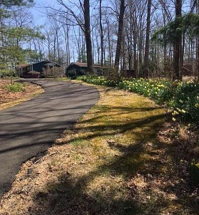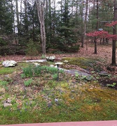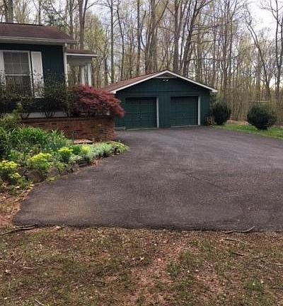 Nestled in the woods you will find a jewel. This home is open and cozy with beautiful hardwood floors, granite counters over beautifull cabinets, skylight, central heat and air but also a wood stove to use on cold winter days. It is enhanced by a large double car garage/workshop and useful out buildings. There are landscaped boarders and rock out croppings. A perfect retreat.