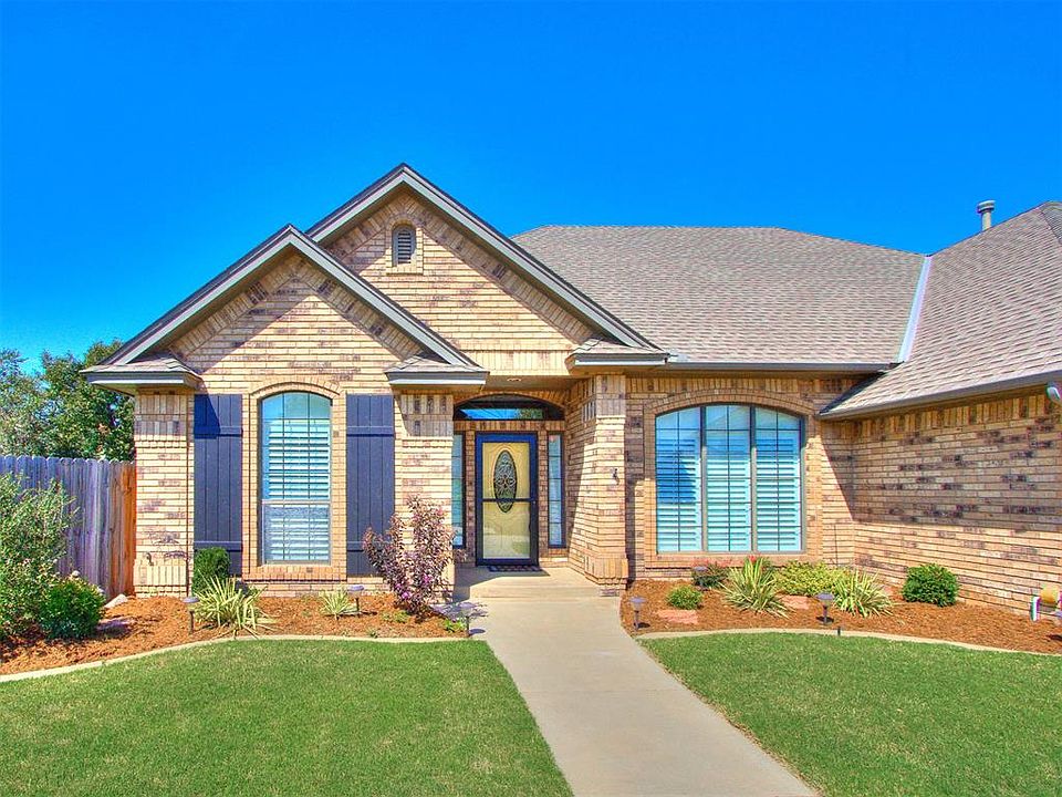 Here’s your chance to own a completely updated home in the always-popular Kingsridge addition! This one has the best of both worlds, a smart, versatile floor plan inside and an outdoor retreat that’s made for entertaining, relaxing, and making memories with the people you love most. Step inside and you’ll notice the natural light pouring in through big windows in the living and dining areas. The beautiful white wood trim and plantation shutters bring so much charm and character. Storage is everywhere, and you’ll love having not one, but two cozy fireplaces to gather around. The primary suite is a true retreat with its own private access to the backyard and covered patio. You’ll also find a spacious walk-in closet, crown molding, double vanities, a whirlpool tub, and a separate shower. The layout is super thoughtful as the third and fourth bedrooms sit on opposite sides of the home, connected by a Jack-and-Jill bath with double vanities. The front bedroom also features those beautiful plantation shutters. Even the utility room is a win with tons of storage and a built-in ironing board. Outside is where this home really shines, sitting on 1.5 lots with a sparkling inground vinyl-lined pool, storm shelter, 2 storage buildings, and a circle drive with extra parking. Plus, the large utility gate makes it easy to tuck away extra storage in the side yard.