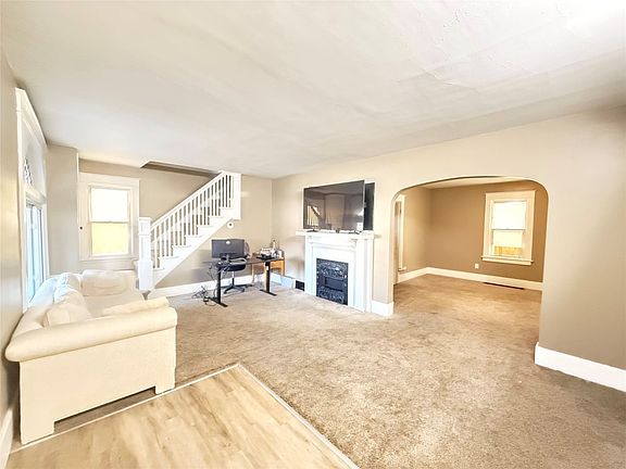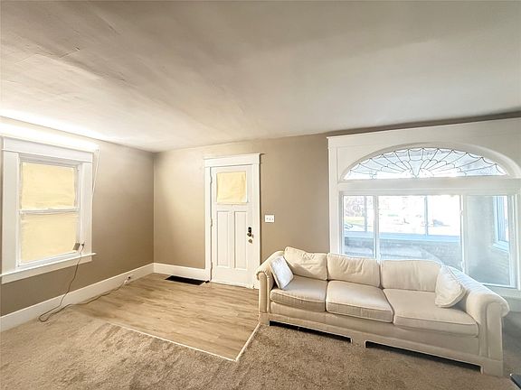 Why rent when you can own! Move in ready 3 bedroom, brick/vinyl two story home on low traffic NE Erie street. Enjoy 3 seasons in your 21 x 8 enclosed porch. Bright and spacious 19 x 13 living room greets you with an ornamental fireplace. Character and charm are obvious with the beautiful staircase and arched entryway into the formal dining room. Kitchen with luxury vinyl plank flooring includes dishwasher, range and refrigerator. Walk out to rear deck (19 x 14) overlooking fenced back yard. Second floor primary bedroom (19 x 13) is bright and spacious. Vinyl, double pane windows throughout home! Two additional bedrooms and updated full bath on second floor. Walk up attic provides additional storage area. Clean, dry basement with washer and dryer included. High efficient forced air furnace and central air installed in 2017! Driveway is shared and usable by both neighbors as each has separate parking in the back. One year home warranty included!