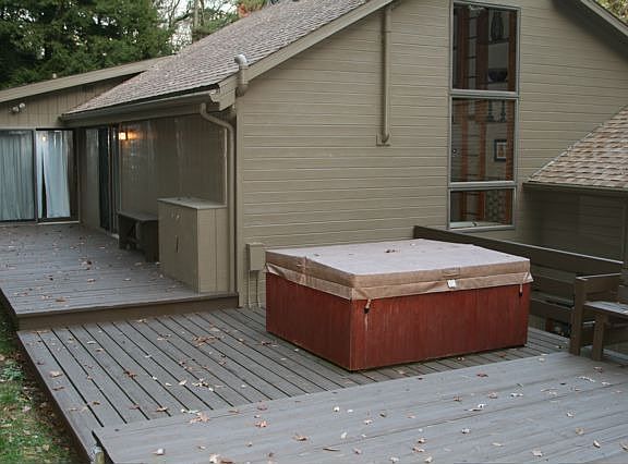 This custom contemporary is creekside on 4.18 acres! The home is loaded with quality features including an outdoor hot tub, sauna, whirlpool bath and a custom newly-remodeled master bath. The dining room and sunken living room are divided by two fireplaces. The nine room floor plan plus baths provides just the right space for all your needs. The oversized two-car garage provides convenient storeage. Like-new floor coverings-carpet, hardwood & ceramic tile-throughout the whole house! The exterior has just been re-finished and landscaped. All in move-in condition!