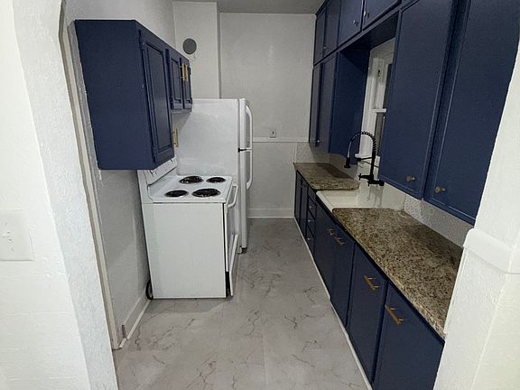 Bright kitchen with navy cabinets, granite counters & updated fixtures