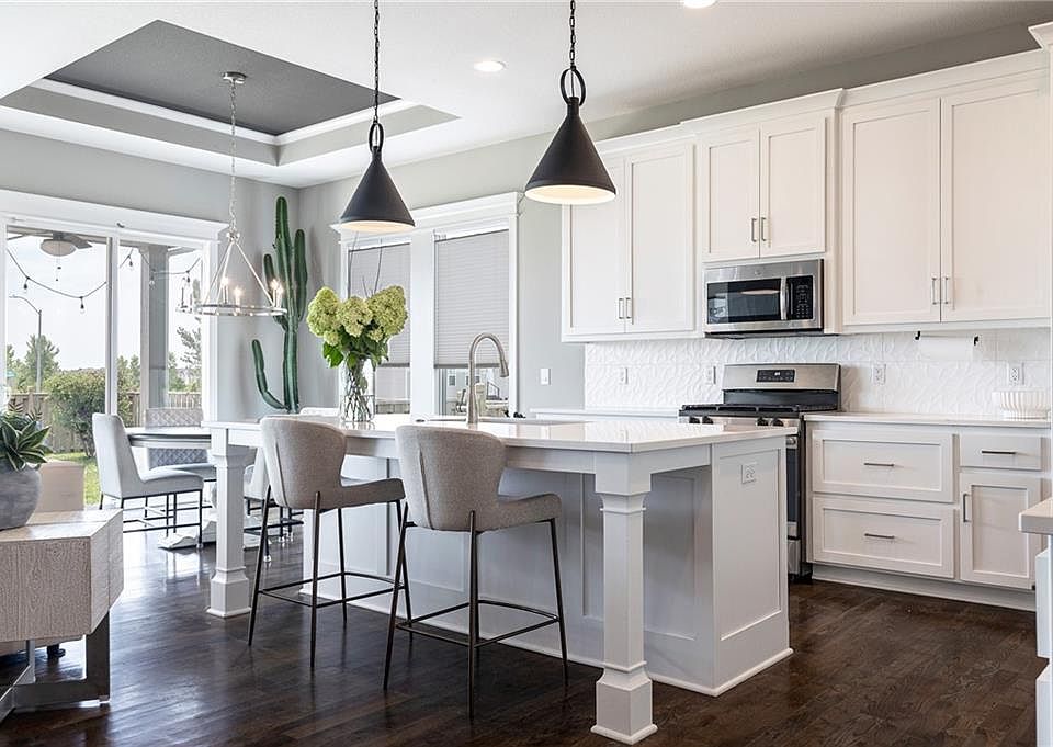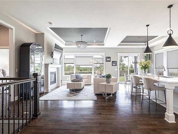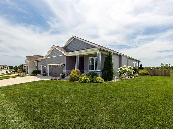 Welcome to this beautifully upgraded home that perfectly blends luxury, comfort, and functionality. Situated on a corner lot, this incredible reverse 1.5-story boasts a spacious open floorplan with soaring ceilings, rich hardwood floors, and stunning decorator touches throughout. The heart of the home features an upgraded kitchen with exquisite quartz countertops, custom tilework, and designer lighting that adds a sophisticated flair to every room. The main-level primary suite is a true retreat, complete with a coffered ceiling, spa-like bathroom, and convenient attached laundry room. The owners have added built-in cabinetry in the primary closet off from the primary suite. A second bedroom on the first floor offers the ideal space for a home office, workout room or guest suite. New carpet has been added along with a fresh coat of paint throughout the home. The finished lower level is an entertainer’s dream—offering a generous rec room, two additional bedrooms, and ample storage space. Step outside to enjoy mature landscaping, a covered patio for relaxing evenings, and an extended patio perfect for summer gatherings. Located just minutes from the conveniences of HWY 150, shopping, restaurants, and the desirable Raymore School District—this home offers the perfect blend of style, space, and location. This one is TRULY MOVE IN READY! Don’t miss your chance to make it yours!
