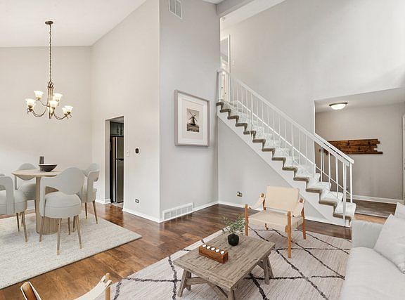 Lovely two-story townhome with large yard space (can be fenced) and beautiful patio. This is a unique END UNIT; Not just on the END, at the END of the neighborhood, backing and siding to tree lines and green space. This largest end unit features cathedral ceilings and lots of beautiful updates. 3 bedrooms, 2 full baths with Updated kitchen. Use the upstairs utility room, attic space & Newer outdoor Shed for extra space. Move in ready with fresh paint throughout from trim to roof. Huge Primary suite complete with sitting area, upstairs balcony & Walk-in closets. Two parking spots. Enjoy the pool and clubhouse on site. Five minutes to the Metra train and expressway. Close proximity to parks & trail head nearby. Full list of updates includes: New Paint Throughout (2025), New Kitchen Cabinet Paint (2025) & Cabinet pulls, New Landscaping (2024), All New Sliding Windows (2022), Added Insulation in attic (2022), New Shed (2021), Quartz Counter Tops with Waterfall (2021), Calcutta Marble Back Splash (2021), Kohler Sink & Faucet (2021), New Concrete Patio (2021), New Laminate Floor (2018), New Water Heater (2018), Ecobee Thermostat (2019), Ring Door Bell (2019), Updated Ground Floor Bathroom (2021), New Fridge (2021), Patio Lights (2018). Come see it before it's gone.