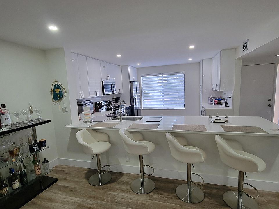Stunning ground floor condo with a lake view at Green Lakes Condominiums, an exclusive 55+ gated community. Welcome to a meticulously redesigned living space adorned with modern accents and high-end finishes. The kitchen dazzles with new cabinets and appliances, complemented by sleek flooring throughout the residence. Sliding barn door adds privacy to the guest room, bath and laundry Opulent glass enclosures the showers, adding a touch of sophistication to the bathrooms. Enjoy a vibrant social scene with the option to join club memberships, offering access to a variety of amenities and activities tailored to elevate your leisurely pursuits. Whether unwinding by the pool, pickleball, tennis, golf or partaking in community events, there's something for everyone to enjoy Conveniently located in Boynton Beach, this prime location offers easy access to an array of dining, shopping, and entertainment destinations, ensuring a lifestyle of convenience and fulfillment. Come experience the joy of Florida living in this remarkable condo at Green Lakes Condominiums - where every day feels like a retreat