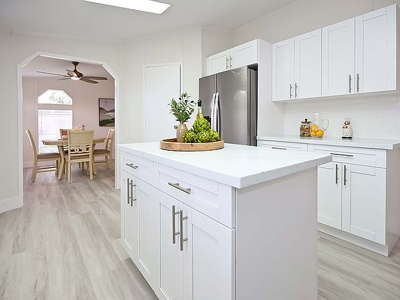 Sitting pretty behind a row of hedges that border its exterior walls, ‘Hedgerow Hideaway’ is a relaxing haven set in the midst of South Florida’s lush greenery. This spacious home, which is located on a corner lot, has a large living and dining area with beautiful new ash toned hardwood laminate flooring throughout that gives it glamorous appeal. Windows on opposite walls invite in plenty of natural light and provide pleasant cross ventilation. All windows are fitted with mini-blinds for privacy. Two elegant chandelier-fans in the living and dining areas lend an air of sophistication. A small partition wall separates the formal seating area from a large kitchen, which has bright white cabinets and matching new stainless steel appliances that include a side-by-side refrigerator (with door-through ice), dishwasher, smooth top range and built in microwave. Gorgeous quartz counter tops offer ample work space, while gorgeous sink with goose neck faucet are stylish and practical additions. A center island offers added counter space and can doubles as a snack counter. The sky light overhead is an interesting architectural feature, as are fixed pane arches above the windows in the adjoining breakfast room. All bedrooms feature beautiful hardwood laminate flooring. The master has a large walk-in closet and an en suite bath featuring an over-sized roman bathtub and separate his & hers basins with ample storage cabinetry underneath. ‘Hedgerow Hideaway’ is dripping with curb appeal. Lovely landscaping includes a lush lawn, pretty manicured hedges, tropical foliage and mature trees. The home's pale yellow siding, sloping shingle roof and decorative shutters are as pretty as a picture. Finally, like all homes in this desirable lakeside community you will appreciate off-street covered parking, central air and heat, your own outdoor storage shed, and access to the community's extensive recreational amenities including fitness, tennis, basketball, putting green, clubhouse, sauna, relaxation room, yoga studio, heated pool complex, lake recreation and more.