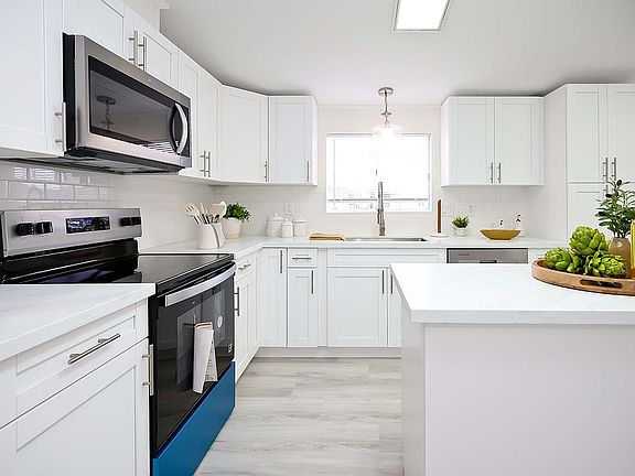 Center islandTropical foliageSky lightGorgeous quartz counter topsMature treesWindows on opposite wallsEn suite bath