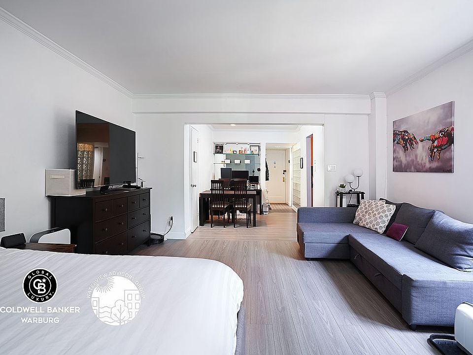 Upon entering this 600 sq ft studio you will have a private dressing room and walk-in closet giving you vast amounts of storage. There is another additional walk-in closet with built-in shelving beside the dining room as well. Even being a studio, there is still separation between living space/bedroom, dining room/home office, and kitchen. This apartment is the only unit that includes a washer machine in-unit and that is grandfathered in! Though it is listed on the first floor, the apartment is a 1-flight up from the street level and receives great natural light.