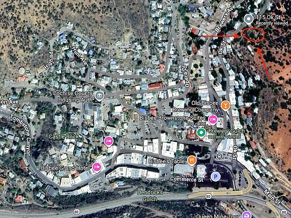 Large 7,533 sqft. lot centrally located in "Old Bisbee" steps from Brewery Gulch. It's labeled in two parts as “380” in the photos provided. Parcel # 103-62-380. Access is from a public stairway just south of 115 Ok Street. I'm not sure about access to utilities but neighboring houses are connected to sewer, water and electricity. Utilities to be verified by the buyer. Sold as-is by owner, zero seller commissions. I'm not a real estate agent.