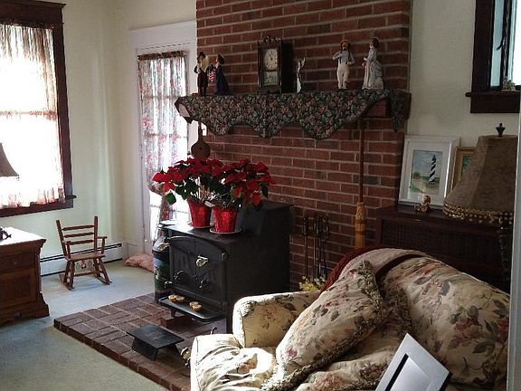 Enter this well cared for home thru the covered foyer into the large living room with wood stove surrounded by brick hearth also there is door to side covered porch, formal dining room bay window, chair rail, pass thru window to the kitchen, kitchen is updated with granite counter top, breakfast bar, eating area, C/Tile back splash, door to rear yard and garage, updated powder room all on main level. Upper level has master bedroom with 2closets, 2nd bedroom also with 2 closets, 3rd bedroom and tiled hall bath, walk up 3rd floor for extra storage. Full basement with work shop and den/work out room. Replacement windows thru out, mini split in the living room.