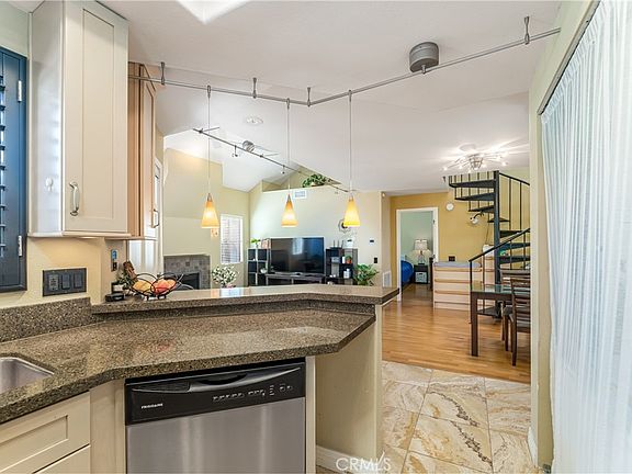 This nice end unit is an elegantly remodeled beauty with wood floors, a spiral staircase to spacious carpeted loft(for home office or guests), vaulted ceilings, brand new water heater, newer a/c(installed 2022) shared garage with extra storage, permitted parking space, cozy gas fireplace, convenient interior laundry and stainless steel appliances in remodeled kitchen with granite countertops & recessed lighting with smart light bulbs, compatible with Alexa appliances.