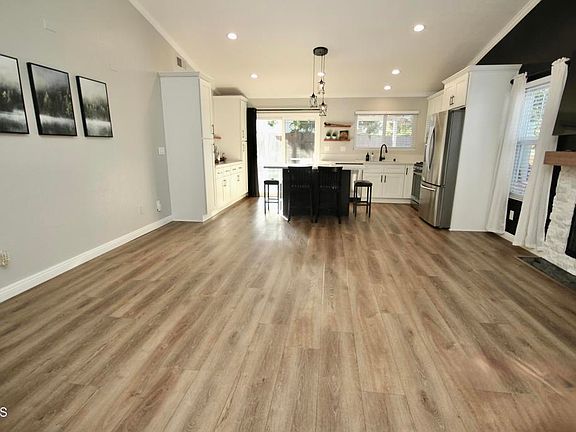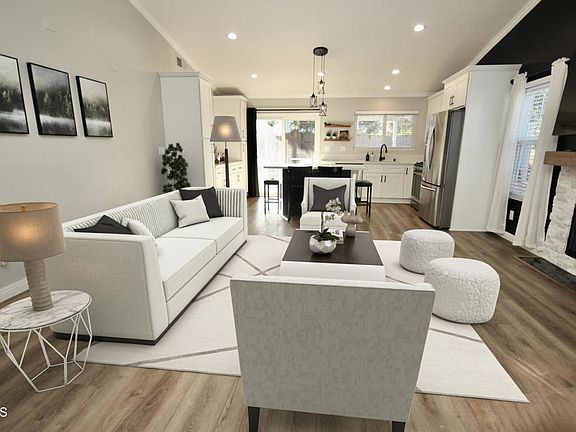 Beautiful Mission Oaks home situated on a desirable corner lot ideal for those seeking a move-in ready home. This inviting single story beauty offers a light and bright and open floor plan. The wall separating the spacious living room and kitchen has been removed to create a large great room, perfect for family gatherings. It also boasts a nice fireplace for cozing up to during the cold weather, upgraded woodlike flooring, beautifully remodeled bathrooms, jetted tub, and custom island kitchen featuring quartz countertops, stainless steel appliances, and additional cabinets with a pantry. The private rear yard with covered patio offers ample space for relaxation and entertainment. Additionally, the low Homeowners Association (HOA) fees include front yard maintenance, access to a community pool and spa, as well as RV parking. The home exudes a sense of pride of ownership and is undoubtedly a must-see. Conveniently located to nearby schools, shopping plaza, restaurants, movie theater, and easy freeway access.