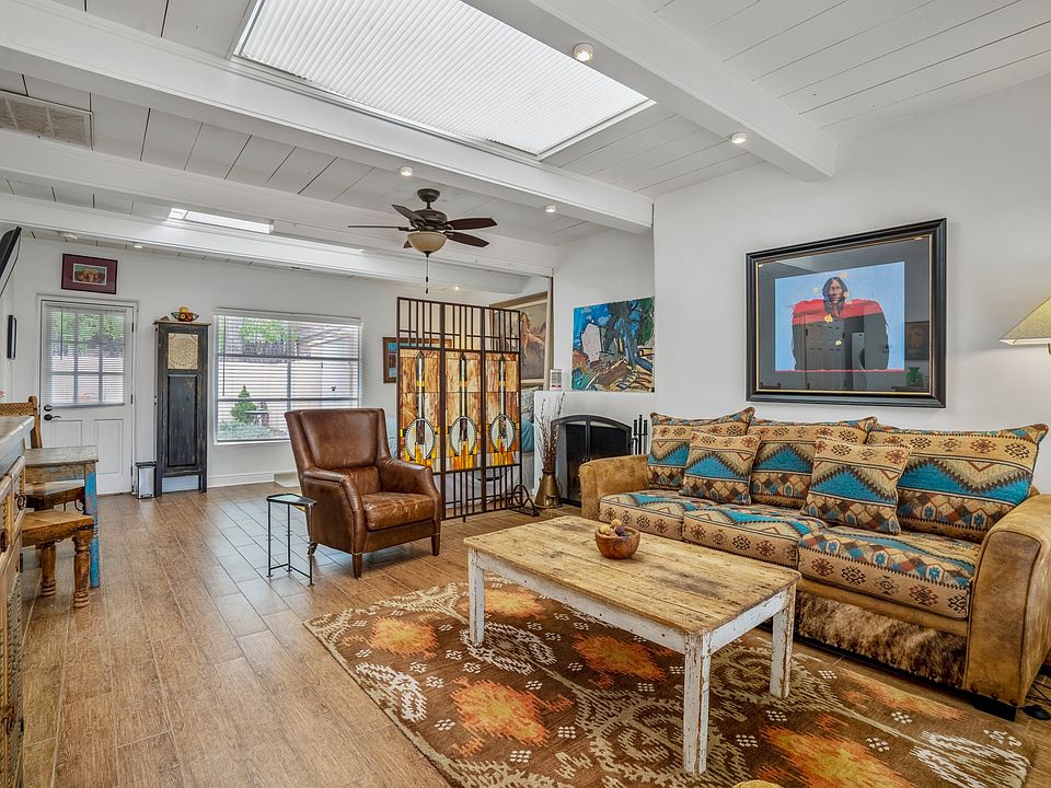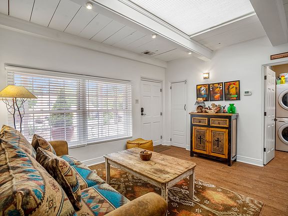 LOCATION, LOCATION, LOCATION! On a quiet lane between Canyon Road and the Santa Fe River, the perfect pied-à-terre awaits. This rare gem is part of a compound of 5. The fully equipped and furnished studio is +/-620sqft has abundant natural light pouring in from skylights and large windows - truly TURNKEY. Features include a spacious kitchen with stone countertops and stainless appliances, beamed ceilings, a wood burning fireplace, and an ultra private rear courtyard. The floor plan accommodates a king bed with movable curtain for added privacy, a luxurious bathroom, hallway storage and in-unit washer/dryer combo. Tile floors & A/C round out the package. Your own secluded oasis is right in the middle of everything that Santa Fe has to offer.