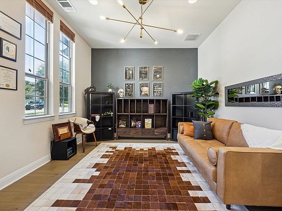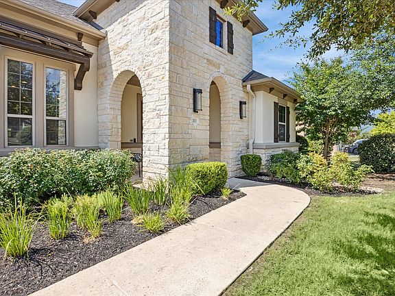 This stunning single-story home captures sweeping views of Central Texas with a perfect blend of modern elegance and timeless comfort. From the moment you step inside, you are greeted by soaring ceilings, wide-plank hardwood floors, and walls of windows that flood the interior with natural light while framing the lush canyon backdrop. The open-concept design showcases a chef's kitchen with an oversized granite island, custom cabinetry, stainless steel appliances, and pendant lighting, flowing seamlessly into the spacious living area anchored by a striking tiled fireplace. A sophisticated dining space with picture windows offers the perfect setting for gatherings, while the designer finishes add warmth and character throughout. The luxurious primary suite provides a true retreat with a spa-like bathroom featuring marble tile, a soaking tub, glass-enclosed shower, and dual vanities. Additional bedrooms are generously sized with private baths, complemented by a versatile study and media room, providing flexible options for work or leisure. Step outside to a covered patio and expansive wood deck, where string lights and comfortable seating invite you to relax while enjoying panoramic sunsets and canyon views. The private backyard, framed by mature trees and custom fencing, offers both beauty and privacy. Perfectly positioned just steps from the community's state-of-the-art amenity center with a zero-edge pool overlooking the San Gabriel River, and minutes from the new Wolf Ranch Elementary, this home combines luxury with convenience. With its refined interior, breathtaking outdoor living spaces, and unmatched location, this residence is designed for those seeking the best of Central Texas living.