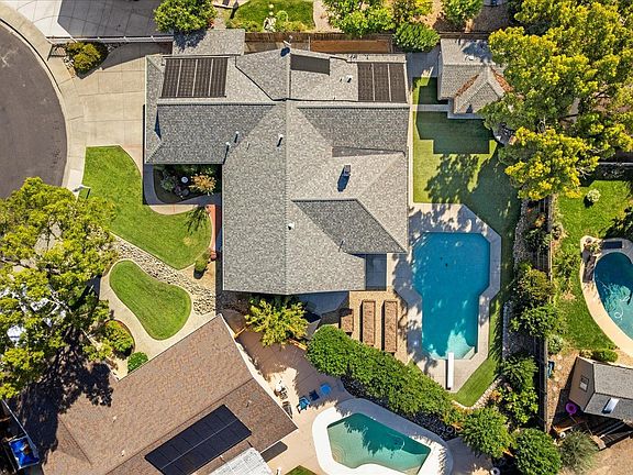 Your backyard oasis awaits! Located in the highly desirable N. Alamo area, this stunning single-story home sits on a peaceful court just minutes from downtown Vacaville. Attached to the home is a spacious covered stone patio with direct gas hookup ready for any outdoor occasion overlooking the pool. Enjoy the privacy of a separate ADU and a resort-inspired backyard with a solar heated pool, with a spa. The ADU offers its own private covered patio, bed, bath, and storage room overlooking lush turf, raised garden beds, and a gated dog run. Inside, the family room centers around a striking stone gas fireplace with raised hearth and built-in storage, while the open living and dining areas flow effortlessly for gatherings. The sleek all-black kitchen highlights granite countertops, a wine fridge, and generous workspace, complemented by a flexible office nook ideal for work or study. The primary suite opens to the backyard and includes a private bath with granite dual-sink vanity and shower over tub. Each bedroom is bright and inviting with ceiling fans, lighted closets, and versatile layouts, while the updated hall bath features a granite dual vanity and elegant tub over shower. Complete with a Nest security and temperature system. You won't want to miss this one!