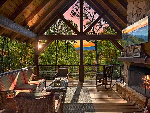 Rare opportunity to own a Keith Sumner (one of Blue Ridge's premier builders) built mountain home that exudes rustic charm and elegance. Make this your full time home or keep the loyal vacationers coming. With over $50,000 in annual short term rental income this elegant home makes financial sense. Ideally the floor plan offers 2 primary suites on the main level and an additional 2 suites on the terrace level. The craftsmanship is exquisite with amazing stone work including 3 stone stacked fireplaces, stone stacked kitchen backsplash, stone counter tops and more. Enjoy a cozy fire as you take in the year-round Mountain view on a chilly morning or evening. Other notable details include soaring wood beamed ceilings, wrap decks, beautiful wood flooring, expansive living areas, hot tub, ping-pong table, pool table, corn hole and an amazing fire pit & out door play space.The spa like bathrooms are a work of art with shower walls adorned with stone, rain shower heads and dual sinks. The location is ideal and offers close proximity to the Cohutta mountains, FightingTown Creek and a short drive to downtown Blue Ridge's wonderful restaurants, shopping, Lake Blue Ridge, scenic railroad, parks and more... This elegant home is being sold completely furnished so bring your toothbrush and starting enjoying life here in the North Georgia mountains... The Mountains Are Calling!