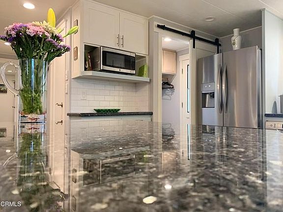STUNNING open plan, 2 bedroom, 2 bath home w/ craftsman millwork including doors w/ new hardware. Kitchen boasts stainless-steel appliances, large basin sink, touch less faucet, refrigerator w/ ice-maker & water filter, quiet Bosch dishwasher, soft close cabinets & pull-out drawers, granite counters, pendant lights, & large pantry garden window. Laundry Room w/ custom cabinets, stack washer/dryer & drying rack w/ folding table. Living Room w/ custom cordless light filtering blinds, gas fireplace for cool days & California evenings. Fireplace hearth features decorative tiles by RTK Studios. Bonus Room features barn door style shutters, shelving & lower cabinet for storage. Master bedroom w/ well-lit windows, cordless blinds, double closet & walk-in closet. Guest Bedroom w/ double glass doors leading to bonus room. Both master and guest baths have newer vanities & soft close toilets. Showers have glass door enclosures and all tiles have been resurfaced. Master shower features a magnetix showerhead w/ multiple settings. Extremely private deck & rear yard perfect for entertaining w/ shaded large & privacy pergola. Deck has amazing views of mountains. Yard is completely fenced w/ access gates on both sides. Tall navel seedless orange tree provides both shade as well as a winter harvest. Auto locking pet door w/ accessories. Roof newly sealed. All new electrical & plumbing throughout. Recessed dimmable lighting inside and out. Vinyl floors throughout, newer shed in 3 car carport.