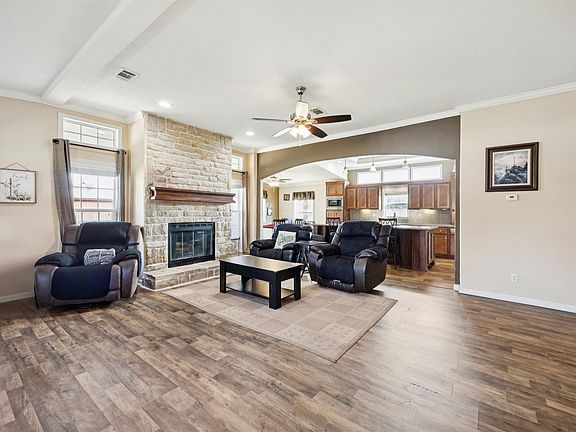 Experience peaceful country living on a full acre, private, quiet, and surrounded by nature, yet just minutes from town conveniences! This beautiful three-wide mobile home offers 4 bedrooms, 3 baths, and spacious living with two inviting family areas and thoughtful design throughout. Step inside to a welcoming living room with vaulted beamed ceilings, a ceiling fan, and a stunning wood-burning fireplace with a stone surround, all open to the kitchen and dining area for seamless entertaining. The kitchen is a true showstopper, a gigantic island, abundant cabinetry, and a built-in oversized refrigerator, truly a chef’s dream. A large utility room includes a sink and full-size washer and dryer connections for added convenience, while the front office provides the perfect workspace for those who work from home. The primary suite is a serene retreat featuring a garden tub, and a separate shower. An additional family room at the rear of the home offers a private space for movie nights or relaxation. Outdoors, enjoy a covered patio overlooking the expansive fenced yard, ideal for gatherings, playtime, or soaking in the country air. plus an above-ground hot tub for ultimate unwinding. This property is complete with two outbuildings, a 2-car carport enclosed on three sides, an asphalt driveway, and 52 solar panels for energy efficiency. Located within the highly regarded Weatherford ISD and just minutes from major highways, this home perfectly blends serene country living with modern comfort and convenience.