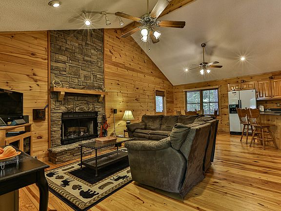 Beautifully Furnished Cabin in the Woods. The covered rocking chair porch wraps around to the back deck, where you can enjoy the soft sounds of the Rock water feature. With Cathedral Ceiling ,the open floor plan allows plenty of room for Dining plus a grilling porch. Main floor; Master Suite with private bath easily accommodates a King bed. The almost completed Basement has a new bedroom, bath, living and Rec area. Just a little flooring and wall covering is needed to be finished. This terrace level extends out to a covered hot tub deck as well. Plenty of privacy, and close to the Coosawattee Gate, pools. tennis courts and many other amenities.
