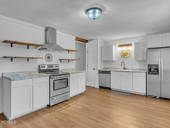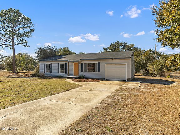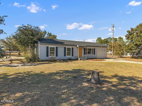 Check out this charming ranch-style home with 3 bedrooms, 1.5 bath, and an attached one-car garage. Situated on a spacious .51 acre corner lot. Inside, the heart of the home features elegant white shaker cabinetry, a pantry for additional storage, stainless steel appliances, and a stylish range hood. The open shelving and new oak-colored flooring create a seamless flow throughout the house, perfect for the beach lifestyle - no carpet in sight! The HVAC system and ductwork were replaced in 2022, and a water treatment system installed in 2023. Updated fixtures and renovated bathrooms provide the perfect bit of extras to this home. The back deck provides a lovely space to host barbeques in your very own backyard. Located just minutes from Camp Lejeune's back gate and a short drive to Swansboro or Jacksonville for dining and shopping.