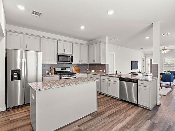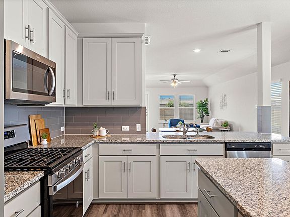 NEW ROOF in Summer 2025! Incredible value in Saddlecreek. This well-maintained 4-bedroom home offers an open floor plan with plenty of storage. The kitchen features stainless steel appliances, granite countertops, shaker-style cabinets, and a subway tile backsplash. Luxury vinyl plank flooring runs throughout the main living areas. The primary suite includes a spacious bedroom, dual vanities, a walk-in shower, a separate water closet, and a large walk-in closet. The living area opens to an extended covered patio and a large backyard. Additional features include full gutters, a water softener loop, and front and back irrigation. Saddlecreek amenities offer a pool, splash pad, fitness center, playground, and trails. Located just 10 minutes from Downtown Georgetown, St. David’s Hospital, and Blue Hole Park, and near major highways like Highway 130 and I-35.