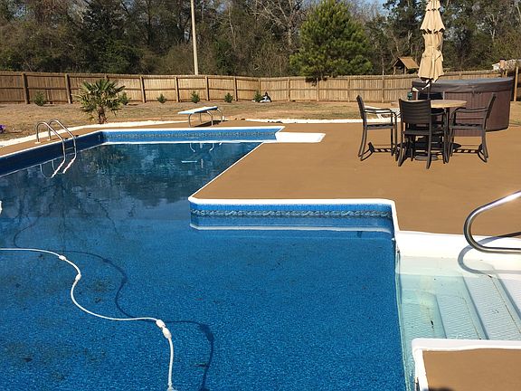 4 bedroom 2 bath, hardwood floors in master bedroom, living room and hallways. New stainmaster carpet in the other 3 bedrooms. Stainless steel appliances in kitchen, including new gas convection oven. Fenced back yard with large L-shaped pool and hot tub out back on 1 acre lot.