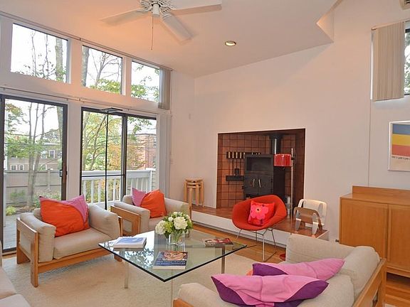 Pristine townhouse with garage parking. Thoughtful floor plan great for entertaining offers a spacious, sunken living room with a Danish wood stove and two sets of sliding glass doors leading to the stone patio and beautifully landscaped garden, a kitchen opening to the dining room with bay window. The second level has two bedrooms and a hall bathroom and the top floor offers a master bedroom with three skylights, walk-in closet, sliding glass doors to a treetop balcony and a bath en-suite. Separate entrance lower level with an 18' room that could be used as a home office or a guest suite. Great location with quick access to Harvard Square, Porter Square as well as Huron Village.