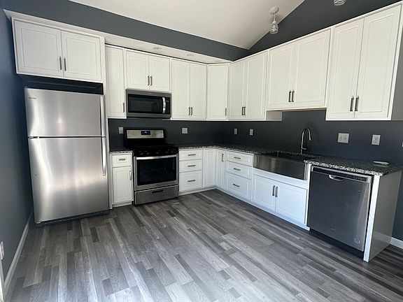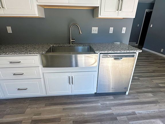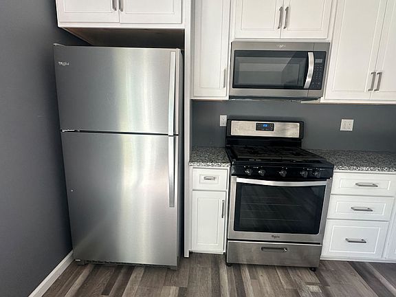 White kitchen cabinetsNew windowsNew vinyl sidingNew laminate flooringHard surface countertopsNew appliances