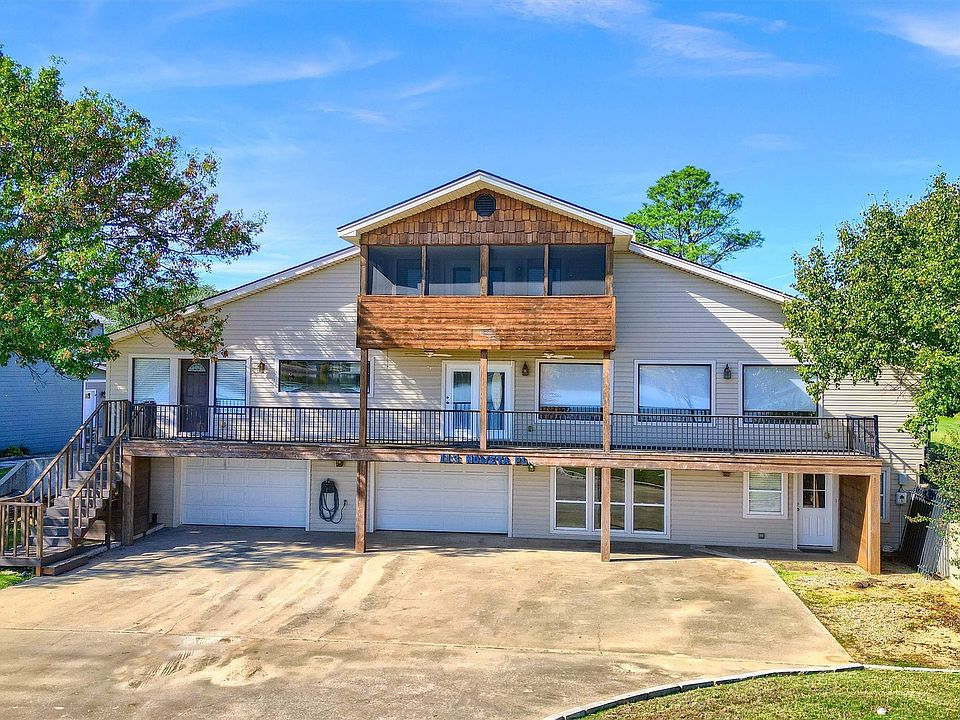 Beautiful water view overlooking the main body of lake. Spacious 3 level home has large living room with vaulted ceiling, wood burning fireplace and wood flooring. Kitchen has granite counter tops, island and double ovens. Upper level primary suite has private screened porch to enjoy lake view. Lower level and game room, bedroom, bath, office and extra living space. 133 linear feet of waterfront complete with boat dock.