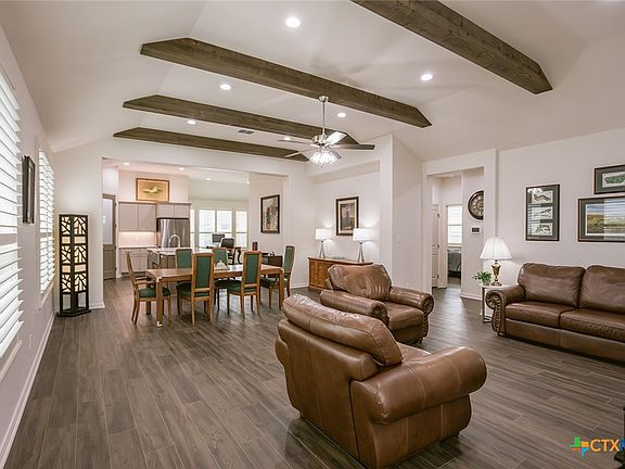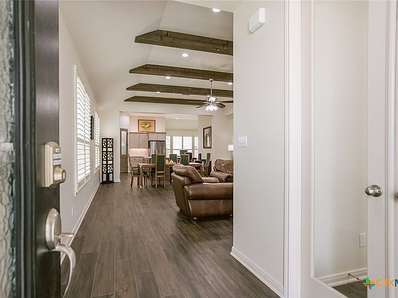 Every detail of this stunning Terravista home exudes quality, comfort, and pride of ownership. Completed in 2023, this custom-built beauty sits on one of only eight oversized lots in Phase 12—uniquely positioned and upgraded far beyond new construction nearby. The gorgeous exterior welcomes you with a custom leaded-glass front door, full guttering, epoxy-coated garage and porches, lush professional landscaping valued at nearly $50,000, and a cedar pergola overlooking thoughtfully designed, low-maintenance garden zones with crushed granite pathways. Inside, luxury continues in every direction you look as you are greeted with high-end luxury vinyl plank flooring, beamed ceilings, recessed lighting, and a stunning double door office/flex/4th bedroom in the entry foyer. This chef's kitchen is setup for flow and entertainment - featuring premium Whirlpool appliances, a Samsung refrigerator, washer, and dryer, and an expansive kitchen island topped with striking quartz countertops. Under-cabinet and over-cabinet lighting, a stainless farmhouse sink, and a custom glass pantry door make this kitchen truly special. The open-concept living area glows with and abundance of natural light when the plantation shutters are open. Walking into the primary suite, you will be enthralled by the vaulted ceiling height with large beams that truly make this space something to be proud of. The en-suite bathroom offers a massive tiled walk-in shower, his/her vanities, an expansive walk-in closet, and breathtaking porcelain tile. The Generac whole-home generator, Renai tankless water heater, and epoxy-finished garage add peace of mind and functionality. THIS BACK YARD OASIS is one from a magazine, with expert landscaping in every corner, a oversized covered back patio, and the crushed granite pathways. With its impeccable condition, designer upgrades, and elevated features everywhere you look, this home feels brand new and stands ten steps ahead of anything else in the neighborhood.