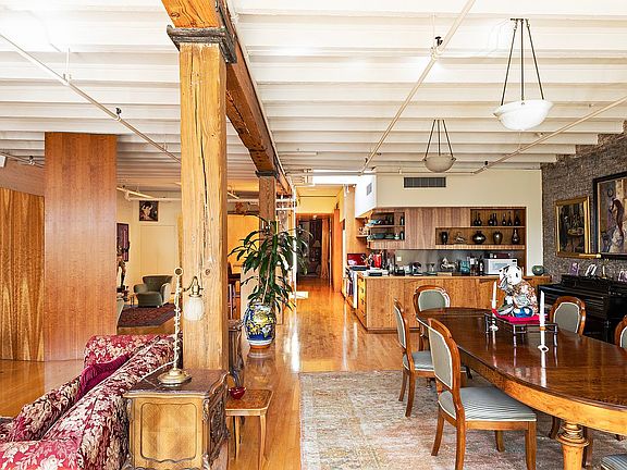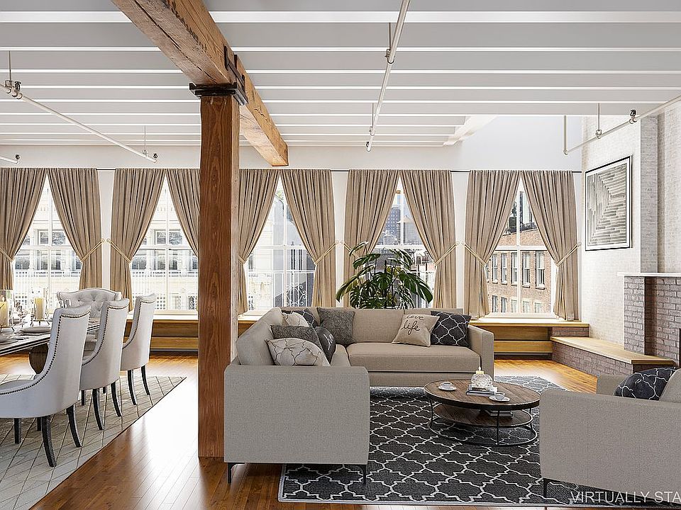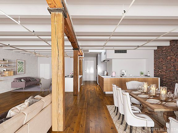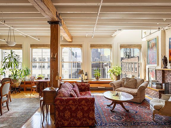 Take the key-locked elevator into this quintessential penthouse loft bathed in southern light and featuring beamed ceilings, exposed brick walls, and picture postcard views of the neighboring cast-iron facades and the Freedom Tower from the 5 enormous double-hung windows. The oversized living area is ideal for entertaining and leads into an open kitchen with an abundance of storage and counter space.