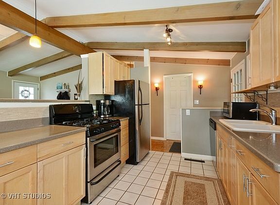 Beautifully maintained from Maple kitchen corian counters, stainless steel appliances opening to a great room. Hardwood floors. Beamed vaulted ceilings. Totally redone baths including a double headed shower with tumbled stone/ custom built-ins. Sitting room off master bedroom walks out to a private deck and paver patio with fire pit. Fenced, Storage shed.