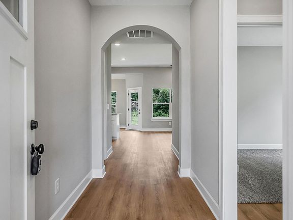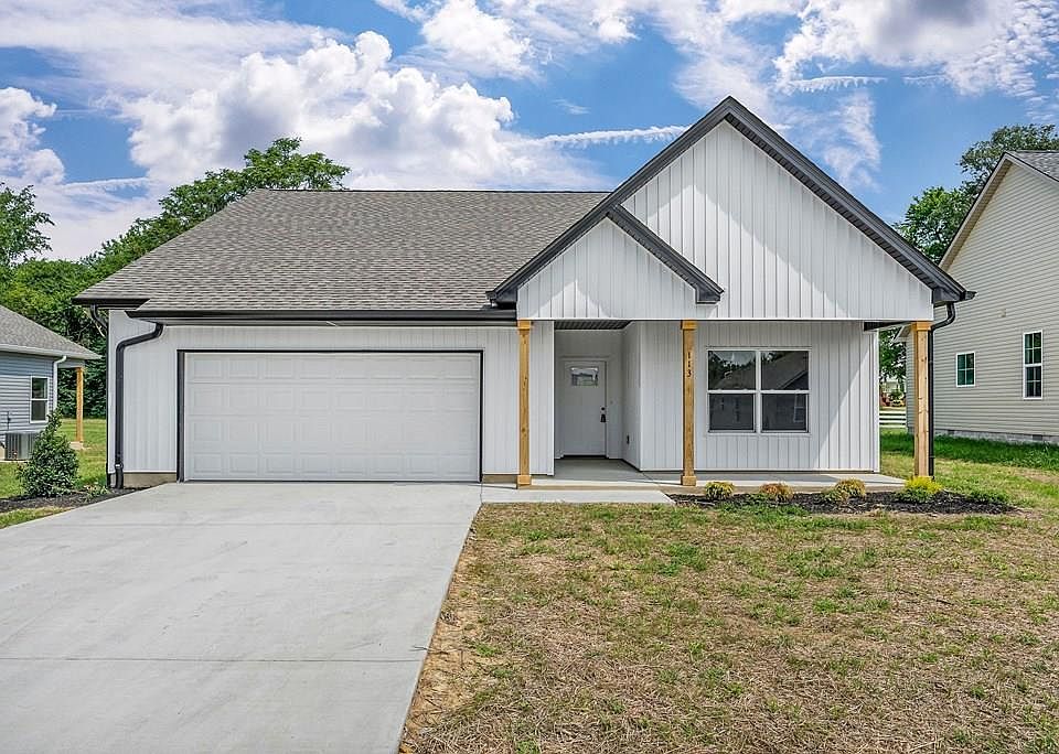 Brand new construction home built on a slab with no steps, making entry easy and convenient. Backed by a one-year builder warranty, this home features tall ceilings and an oversized two-car garage. Inside, you'll find custom cabinets and built-in shelving throughout, an electric fireplace in the living room, and a kitchen equipped with new stainless steel appliances, granite countertops, and a tile backsplash. The primary suite includes a tile shower, soaking tub, and a large walk-in closet. Enjoy peaceful outdoor living with covered front and back porches and a tree-lined backyard. Move-in ready with modern finishes and thoughtful design.