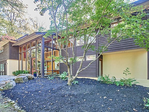 Designed by renowned Chapel Hill architect Jim Webb, this striking Modernist home is a serene retreat nestled among the trees and rolling hills of Chapel Hill. Expansive walls of glass and a soaring vaulted ceiling create an effortless connection to nature. Skylights bounce light around the space, while treed views create a sanctuary of serenity and calm. Original design details abound: A slate floor entry, lovely hardwoods, custom cabinetry, rich wood paneling, a dumbwaiter, solid core doors and a cozy wood-burning fireplace—reflecting the timeless craftsmanship of Webb's vision. A shoji screen leads to the bright sunroom at the rear of the house, perfect for reading or bird watching. A large sparkling indoor pool with adjacent shower/changing room is absolutely perfect for entertaining! The artist studio, dark room, and (newly rebuilt) hydroponic greenhouse inspires creativity. Outside, a lovely Japanese Maple greets at the entry, and 2 decks overlook garden beds full of azalea, rhododendron, magnolia, hellebore, ferns and gardenia. A short stroll down the street leads to Parker Preserve + Mason Farm Trails. This incredible location, no more than 10 minutes to UNC, NC Botanical Gardens, Carrboro, Merritt's Grill, Jordan Lake, etc, is a rare opportunity to own an iconic piece of Chapel Hill's Modernist heritage.