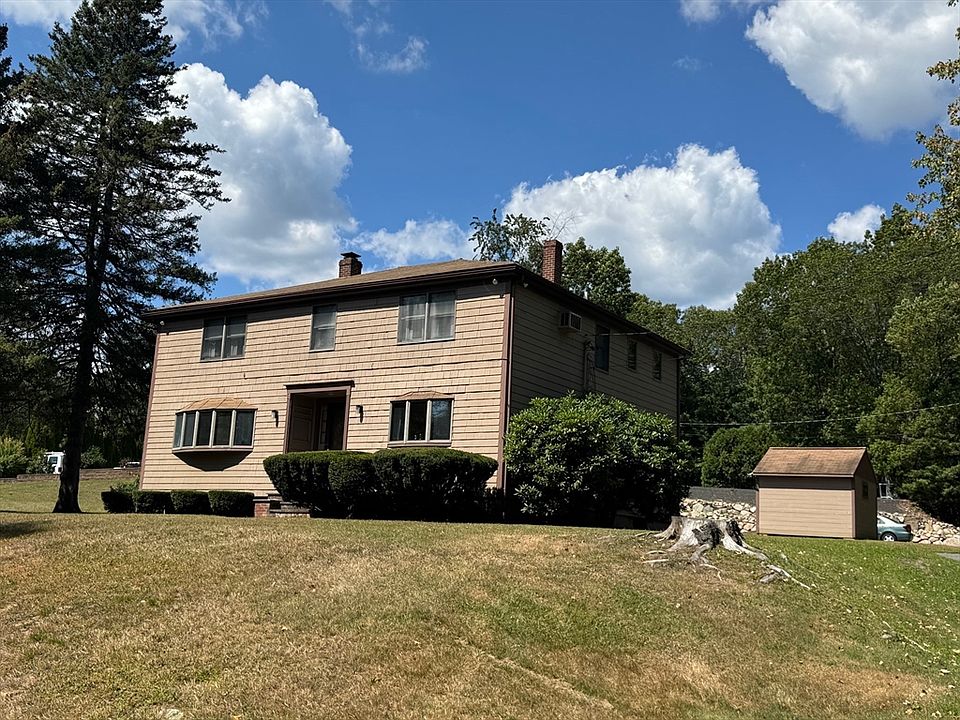 Check out this 5 bedroom, 3.5 bath Colonial on a 1/2-acre lot set in a desirable neighborhood! Foyer opens to a fireplaced living room on one side & the dining room on the other side. The kitchen sports ample raised-panel, oak cabinetry, a pantry closet + another closet & a built-in ironing board! The first-floor bedroom could come in handy if needed for someone that can't navigate stairs. Combine it with unfinished storage room (10'x17'), and it could become a nice in-law suite. The den with access to a deck, a half bath + a 3/4 bath, & a large storage room that offers potential for additional living space complete the 1st floor. The 2nd floor houses the primary bedroom with en-suite, 3 additional bedrooms & a sitting room with a door to a balcony overlooking the big back yard with a brick patio & a storage shed. That room could be useful as an area for watching tv, gaming, homework, etc. Home needs updating but offers a lot of potential to the buyer that wants to build sweat equity!