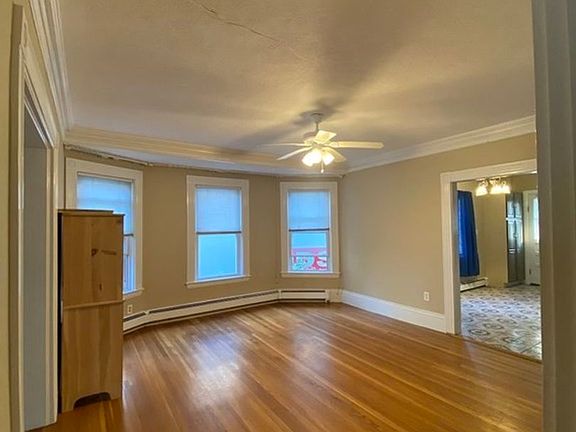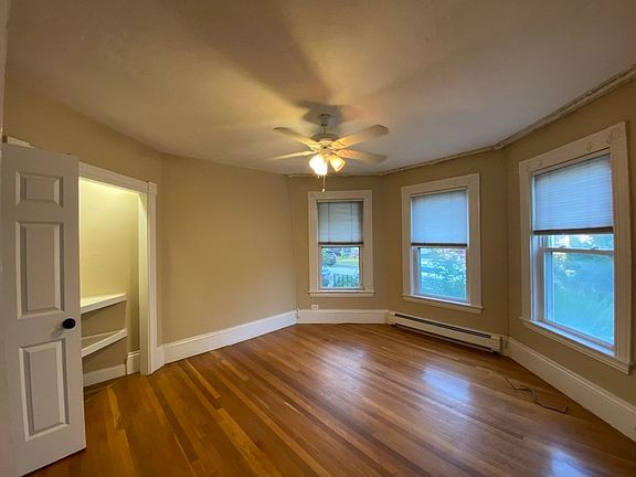 3-floor condo in townhouse duplex with Eat-in kitchen. Large kitchen, dining room and living room. Hardwood floors throughout the unit, High ceilings and fans. Semi-finished attic carpeted. 2 driveway parking spots included. Free laundry in the private basement. Gas heat with separate thermostats on the first and second floors. Large closets, Basement and attic storage. Bonus alcove room for office or other on the second floor. Total 2,100 sq ft + plus semi-finished attic space. Walk to 71 & 70 MBTA bus, Express Buses to Boston. Elementary School area. Non-smoking. Pets considered (cats preferred)