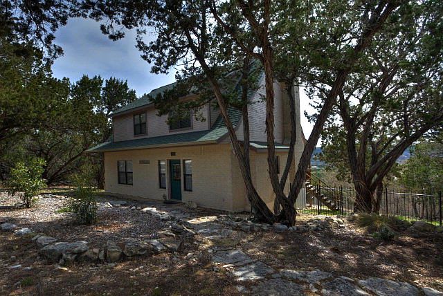 Immaculate home high up on the top of the hill with panoramic views and quiet hill country setting describes this 3/2 inviting home. This is an open floor plan with high ceilings. Saltillo tile throughout the home with carpet in the bedrooms and upstairs loft. The second story would make a great office, grandkid room or guest rooms. Very desirable subdivision minutes away from town. The detached garage is adjoined with its own separate deck and a large 16'x8' workshop with electricity. A private road leads to the property into a private cul-de-sac and has a spot for an RV.Broker is authorized to inform buyers that the furniture is negotiable (excluding the bedroom furniture, upstairs recliner and table, work and garden tools.