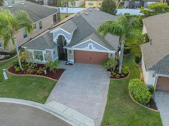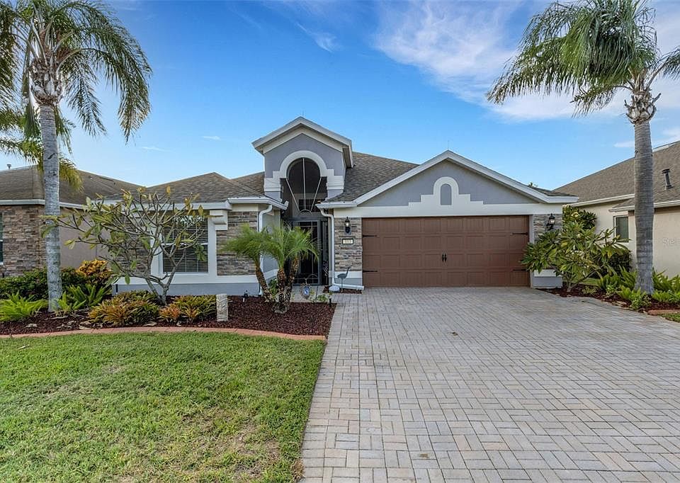 1 YEAR HOME WARRANTY included. Located in the 55+ community of Del Webb Orlando, this popular Madrid model located on a large lot on a cul-de-sac features 2 bedrooms, plus a den and 2 bathrooms. This one-owner home is a smoke-free and pet-free environment. You enter the home into a spacious living area with ceramic tile floors and large glass pocket sliding doors that give way to a beautiful enclosed lanai/Florida room adding to your living space square footage. The spacious Florida Room opens to the living area, the breakfast nook, the primary bedroom and the primary bathroom and features a ceiling fan, pull down shades and screens for the option to invite the outside in with open windows. The kitchen has granite countertops with backsplash, pull out drawers in the cabinets, NATURAL GAS stove, a pantry and a breakfast nook. The dining room features a chair rail. The master bedroom is in the rear of the home for ultimate privacy and features a large walk-in closet, a gorgeous master bathroom retreat that has been REMODLED to include a SPACIOUS WALK-IN TILED SHOWER with a pebble floor, a heater and granite countertop with double sinks. The guest bedroom and bathroom is located in the front of the home giving your guests their own space. The office/den with French doors is located adjacent the living room. The laundry room includes the washer and dryer, a utility sink and extra storage closet. Additional upgrades include GENERAC WHOLE-HOUSE NATURAL GAS GENERATOR, SOLAR TUBE in the kitchen for extra natural light, a whole-house CULLIGAN WATER SOFTENER AND REVERSE OSMOSIS FILTRATION SYSTEM, attic ventilation, ceiling fans throughout, and the home is equipped with surround sound. The garage has extra storage shelving, pull-down attic stairs and a painted floor. The exterior of the home features decorative stone, screened-in front porch, a widened PAVER driveway, concrete landscape curbing, rain gutters, lightning rods, mature landscaping and a large private back yard with extra paver pad for your grill. BEST OF ALL this home includes SOLAR PANELS greatly reducing your energy costs (Assumable Lease). NEW ROOF in 2022. Tile grout professionally cleaned 2024, Exterior painted 2022 and Interior painted 2024. The $425 semi-annual HOA fee provides 24x7 staffed security gate and master association-owned private road maintenance. Adjacent to recently renovated 18-hole White Heron Golf Club. The $328 monthly Del Webb HOA fee includes lawn maintenance and exclusive access to resident-owned 30,000+ SF Montecito clubhouse and amenities. DEL WEBB ORLANDO is a 55+ community with a tavern, indoor walking track, fitness center, indoor and outdoor pools and spas with locker rooms and showers, billiards, ping pong, craft room, and a ballroom for special events. Outdoor activities include pickleball, tennis, bocce, basketball, shuffleboard, community gardening center, an outdoor amphitheater, large brick fire pit and large screened-in gazebo over the water. Miles of biking and walking trails within Ridgewood Lakes gated community. Located conveniently to shopping at Posner Park (4 miles), Disney World, Universal Studios, Orlando & Central FL entertainment nearby. Easy access to I-4, medical facilities, airports & Sunrail Station. Advent Health hospital is 3 miles away.