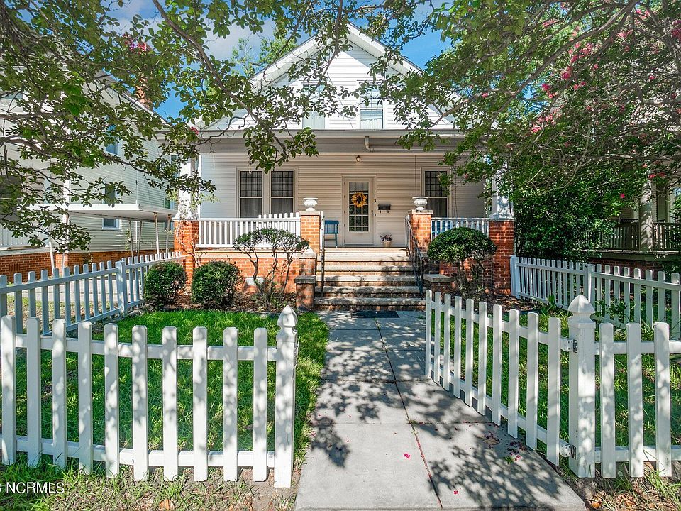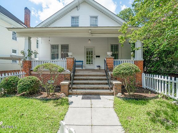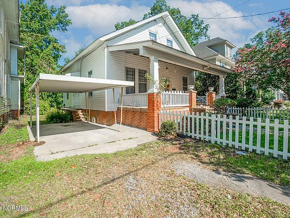 1950's home located in the historic district of Elizabeth City on one of the last brick streets. Large welcoming front porch that has been completely rebuilt from bottom up. Fresh paint downstairs, new AC unit for upstairs, newer siding, and new insulation. Oak wood floors in living room and dining room. Some classic features include: 16 panel windows throughout (covered with storm windows), glass and brass door hardware, and patterned glass at top of each door for light. This 3 bedroom and 2 bath home was once used as duplex but will now need to be used as single family residence. There is one bedroom and full bath downstairs with the other 2 bedrooms and full bath upstairs. Spacious backyard and carport in driveway. Rear access road to property.