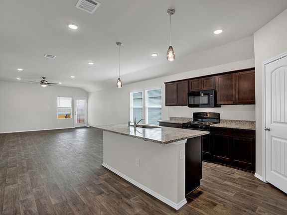 pantry, and new black appliances. The kitchen opens to the dining area and family