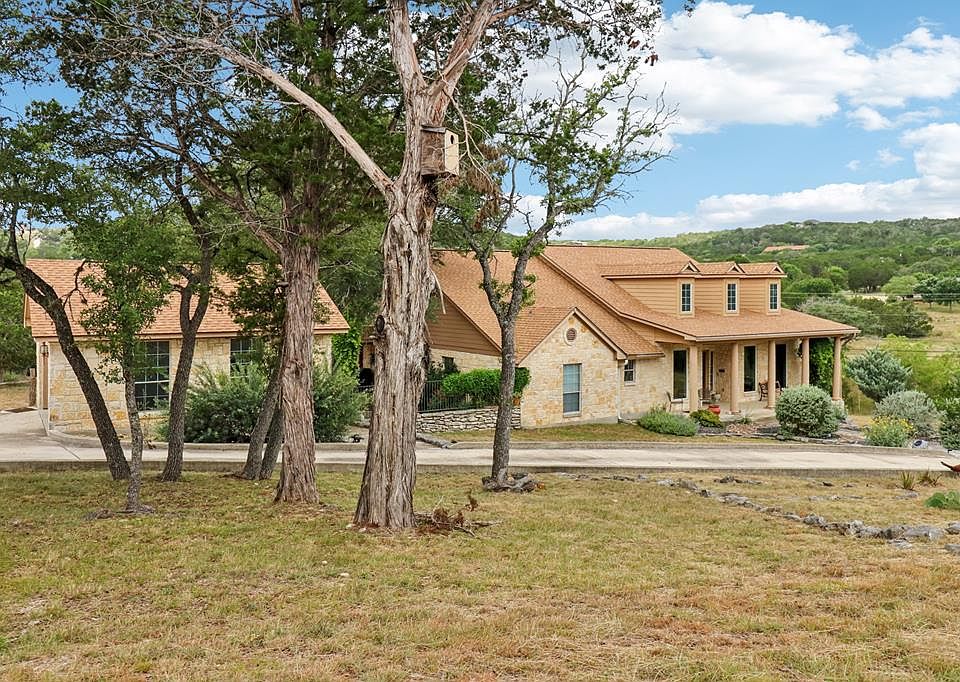 Welcome to this stunning Hill Country–style home perfectly situated on a serene fenced 3.0-acre corner lot, offering peace, privacy & the beauty of nature. The partially wooded property attracts deer & an abundance of wildlife, creating a truly tranquil retreat. This versatile 3/3 home features two spacious living areas, an open kitchen with granite counters & abundant cabinetry & large walk-in closets. The majority of windows are new Andersen windows. Upstairs, a generous bonus room with full en suite bath and large walk-in storage closet is perfect for a 4th bedroom, private office, or guest suite. The inviting stone exterior, wide front porch & sweeping Hill Country views set the perfect backdrop for relaxed country living. The open terrace has a constant breeze. Horses are welcome & the property provides plenty of room to add a shop, barn, or additional improvements with convenient street access. Enjoy the charm of a quiet setting while still being just minutes from town, dining & shopping. Whether you're searching for a family home, weekend getaway, or space to grow, this property blends comfort, flexibility & the best of Hill Country living in one beautiful package.