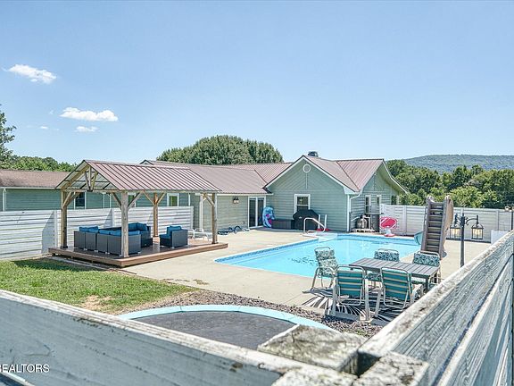 Sweeping year-round mountain viewsGas fireplaceHeated saltwater poolHalf bathroomAuto liftInground trampolineNew windows