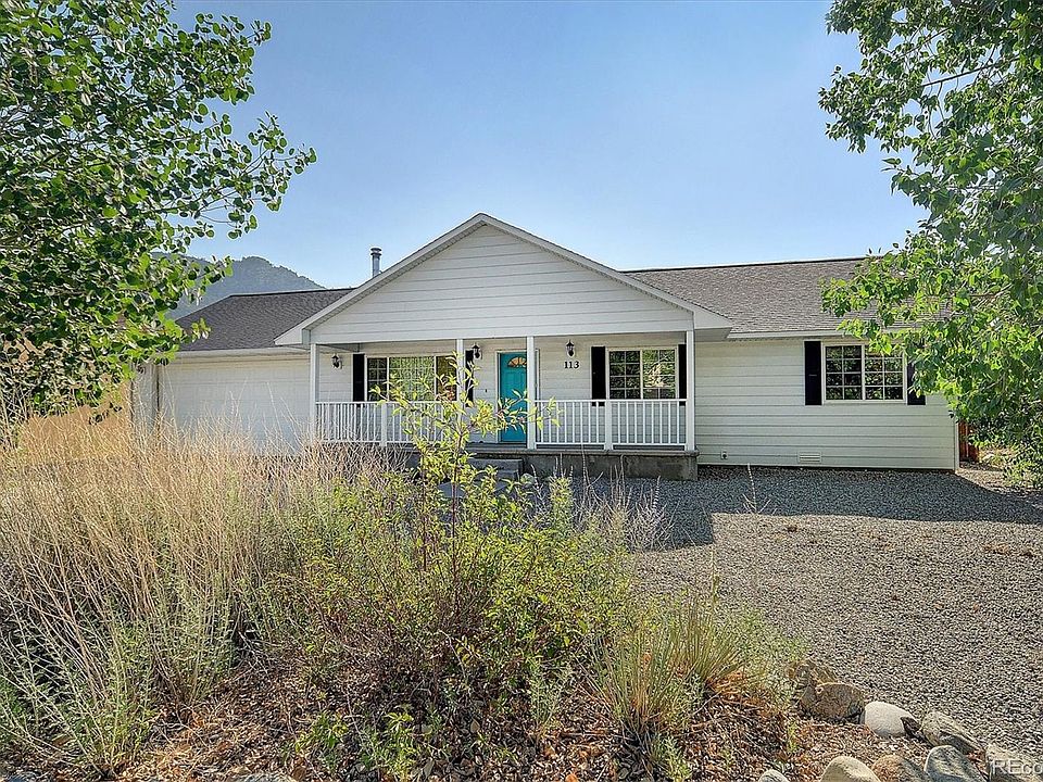 Welcome to this one level ranch style home with an inviting covered front porch in a great neighborhood. The open floor plan has lots of natural light, oak hardwood floors, wood stove and vaulted ceiling that make a great space for entertaining or relaxing. Kitchen boasts lots of cabinets and drawers and is open to the living room. Separate laundry with washer and dryer included. French doors open to the backyard patio area, low maintenance and nicely landscaped with lots of trees and gardens. Oversized 2-car garage with a workshop has a convenient door to the backyard. Great neighborhood is within walking distance of a park, the high school/middle school and sits only a few blocks from the river and walking and biking trails. Easy walking distance to Historic Main Street for coffee, yoga, friends and dining. A great place to enjoy the Mountain River lifestyle and the convenience of everything a small Town has to offer!