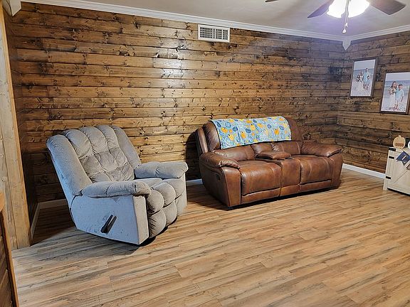 New roof in 2021. Crown molding and spruce wood planks line the walls of two bedrooms, living room, bathroom, and hallway. Refinished bathtub with new tub surround. Large master bedroom. Original knotty pine kitchen cabinets and walls. Laminate and vinyl flooring throughout the home. Covered back patio with fenced in back yard.