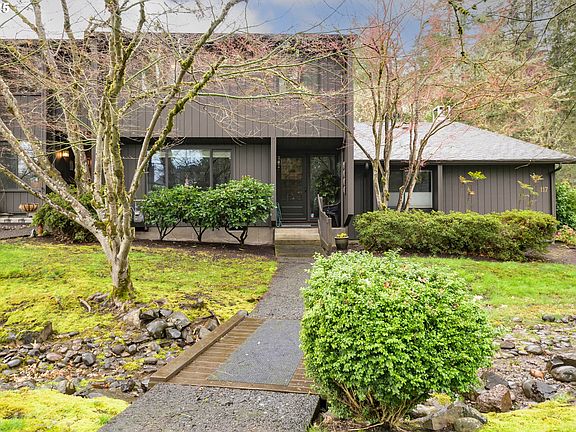 You might think you are in a forested oasis, walking through the parklike grounds and crossing a picturesque bridge to this peaceful setting for a townhouse. It has an excellent floorplan with two guest rooms having a separate bath. Updating has included new quartz countertops and hardware in the lovely kitchen that adjoins a patio room, opening with sliding doors to a lovely patio, and a gas fireplace in the corner. There is an un forced air and cooling system (unusual for complex). The main bedroom has a walk in closet, bath, and unique deck to enjoy the treetop views. Just steps from a pool, and Lodge like clubhouse, this is a great location in an award winning designed planned unit community built around Brae Burn Creek. There is a walking path around the creek which connects eventually through Edgewood West to the Ridgeline Trail. Just under a mile to Edgewood Shopping Center, schools and parks are on the route. There was a new vapor barrier installed in the crawlspace in 2018, paio doors in 2020. 3 miles to University of Oregon. complex is renovating with new roofs, siding repairs, paint. All garage doors have been replaced since 2010. Walk around the lovely grounds and you can see the work being done. The clubhouse is a dramtic two story lodgelike structure with a full kitchen and gas fireplace.