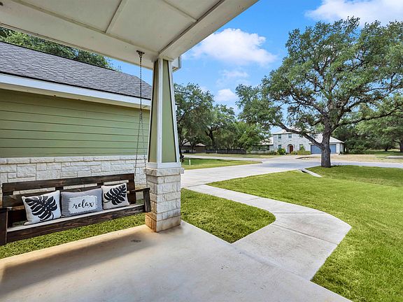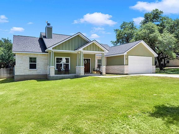 Welcome to this charming craftsman single-story, three-bedroom, two-bath home, perfectly designed for comfort and style. The inviting front and back covered porches are ideal spots to unwind and savor the beauty of Hill Country evenings. The home features elegant tile flooring throughout—no carpet—enhancing the modern decor and easy maintenance. The spacious family room boasts a cozy wood-burning fireplace and flows seamlessly into the open kitchen, making it perfect for entertaining. The garage has been thoughtfully sealed and currently serves as a versatile game area, but can easily be converted back for parking if needed.Step outside to your large, private backyard, where you'll find an above-ground swimming pool and a generous patio space, perfect for hosting gatherings. Mature, majestic oak trees provide ample shade, creating a serene outdoor retreat. This home is conveniently located close to town, offering easy access to wineries, restaurants, and shopping. This property truly captures the essence of Hill Country living.