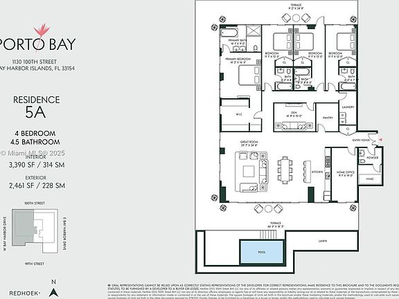 Residence 5A at Porto Bay offers 4 bedrooms plus a den and 4.5 baths with 3,390 SF of interiors and 2,461 SF of outdoor space featuring a private pool and lawn. This expansive home showcases a bright great room with open living and dining areas, European oak floors, and a gourmet island kitchen with Bosch appliances and travertine countertops. The primary suite includes a walk-in closet and spa-inspired bath with dual vanities and Porcelanosa finishes. Three secondary bedrooms feature en-suite baths, while a den, powder room, home office, and laundry complete the layout. Enjoy boutique island living with a gym, sauna, cold plunge, elegant lobby, and rooftop pool with panoramic views.