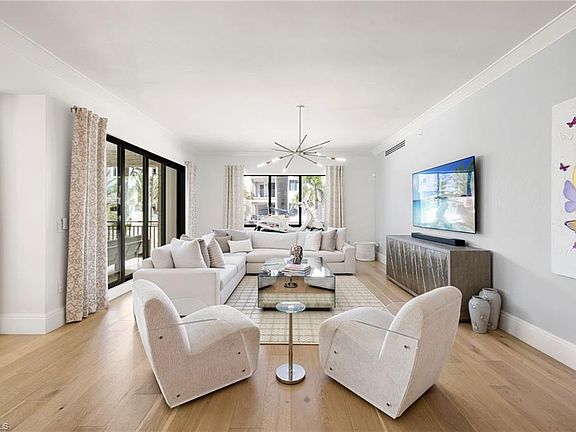 UNIQUE & EXCLUSIVE CORNER RESIDENCE IN QUATTRO AT NAPLES SQUARE. The only unit in the building with direct walk-out access to the pool deck and direct access to steps down to 3rd St S. This fully customized, professionally designed home features an enhanced floor plan and luxury upgrades throughout, far exceeding developer standards. Beautifully finished with upgraded marble, stone, and fixtures. Premium additions including an infrared sauna, soda water on tap in the bar, and modern Italian designer lighting. This 3 bedroom + den residence lives like new construction and showcases hardwood flooring throughout, 10’ ceilings, impact-resistant windows, custom built-ins with illuminated purse and shoe displays, a walk-in pantry, motorized shades, water filtration/conditioning, and more.The chef’s kitchen is appointed with a commercial Sub-Zero refrigerator, upgraded Wolf appliance package with natural gas cooking, a wine fridge, and a wet bar with ice maker . Additional features include two side by side garage parking spaces with EV Charging, a private storage unit, and access to the exceptional amenities of Quattro and Naples Square.A resort-style pool with firepit and grilling area, fully appointed social room with kitchen and billiards table, and a state-of-the-art fitness center.Perfectly positioned in the heart of downtown Naples, just a short walk to 5th Ave S shopping & dining, 3rd Street South amenities, and world-class beaches and parks.